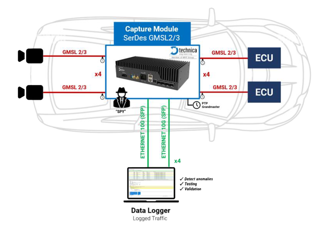 Capture Module SerDes GMSL2/3 The Capture Module SerDes GMSL2/3 from Technica Engineering GmbH is a versatile and powerful device for logging data in automotive applications, such as AD/ADAS. It features 4x GMSL2/3 link lines (8 ports) and 4x SFP+ ports for high-speed and reliable data logging output (up to 10Gbps each).